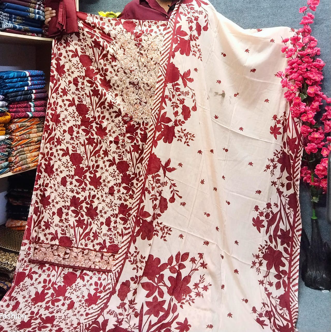 ড্রেস এর নিছের প্যানেলে টিসু কাপড় এর উপরে এমবড্রারি এর উপর সিকুয়েন্স করা,